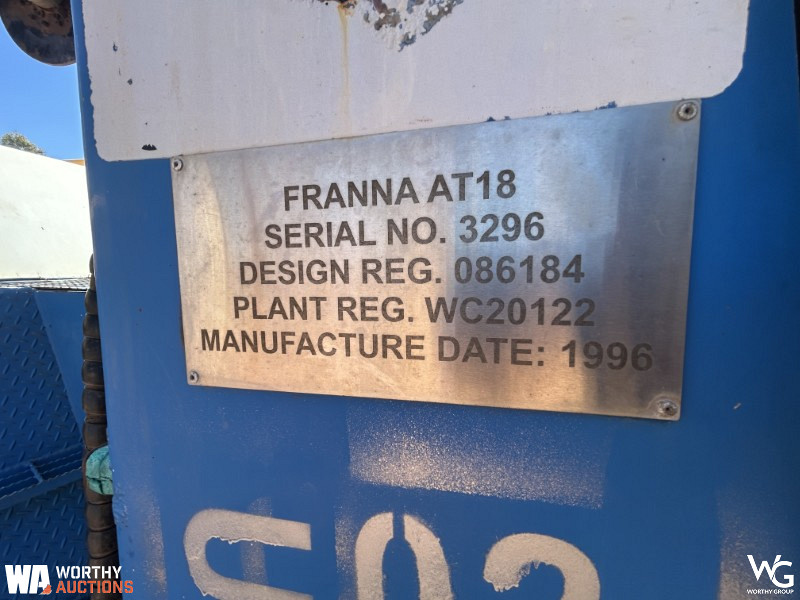 1996 Franna AT18 Crane. Serial # 3296. Hours showing 1473. Inspection recommended. Located in Coolgardie. **Available subject to prior sale**