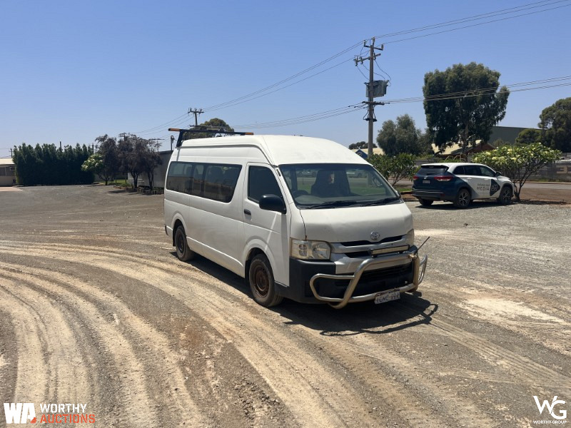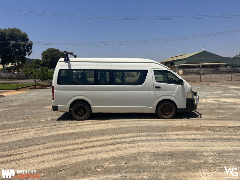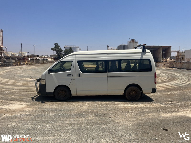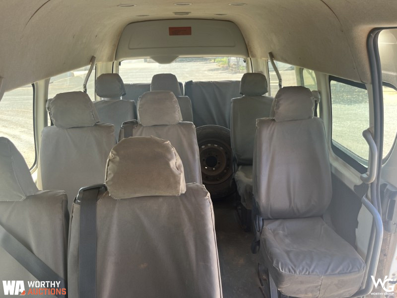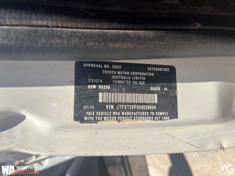 2014 Toyota Commuter 200 Series Bus. VIN # JTFST22P800020624. Odometer showing 193270Kms. 14-seater. Automatic transmission. 3.0L Turbo Diesel engine. Registration expires 18th February 2026. Located in Kalgoorlie, WA. This vehicle has not undergone a mechanical inspection by Worthy Group. A basic visual inspection has been conducted. All vehicle performance details are based on information provided by the seller. Worthy Auctions does not guarantee the accuracy or completeness of this information. Buyers are strongly encouraged to perform their own inspections and due diligence prior to purchase.