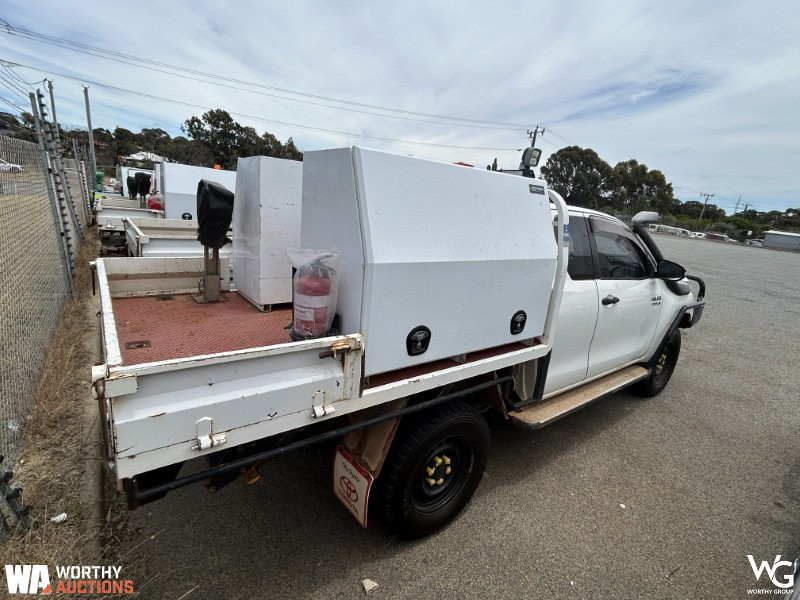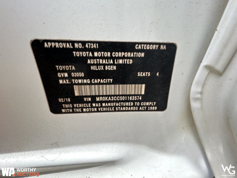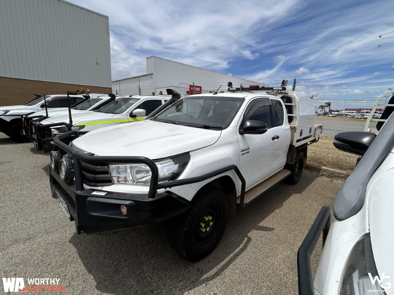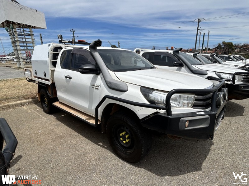 2018 Toyota Hilux SR ExtraCab. VIN# MR0KA3CC501163574. Odometer showing 182073Kms. Automatic transmission, 2.8L Turbo Diesel engine. Toolbox, Vice & Mine Bar, 2 keys. Registration expires August 2026. Sold as is where is. Located in Perth.