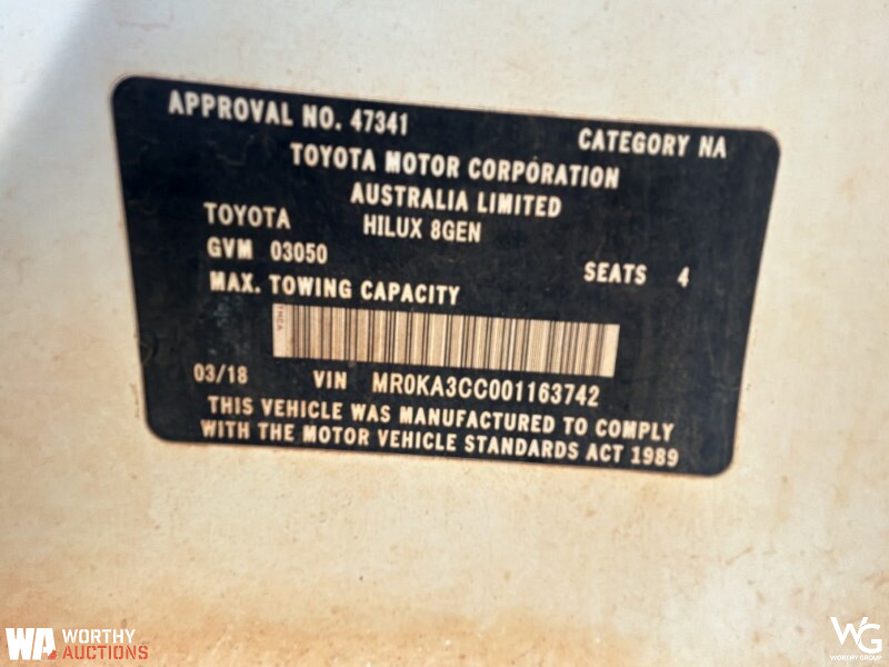 2018 Toyota Hilux SR ExtraCab. VIN# MR0KA3CC001163742. Odometer showing 174946Kms. Automatic transmission, 2.8L Turbo Diesel engine. Comes with 2 keys. Registration expires August 2026. Located in Perth. Sold as is where is.